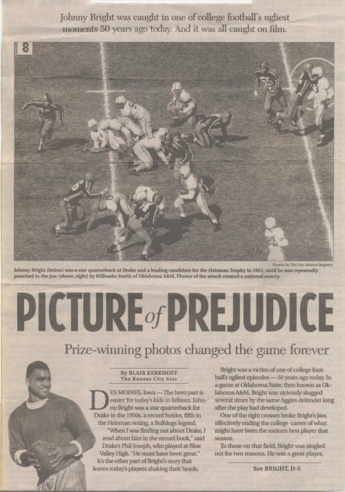 On October 20, 1951 during an away game at Oklahoma A&M (now Oklahoma State University), Drake University standout Johnny Bright had his jaw broken and was knocked unconscious by Oklahoma A&M player Wilbanks Smith. In 1949, Bright had become the f...