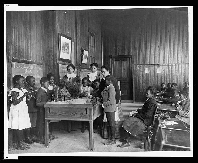 African American children are learning about Thanksgiving with a model log cabin on the table at Whittier Primary School in Hampton, Virginia.